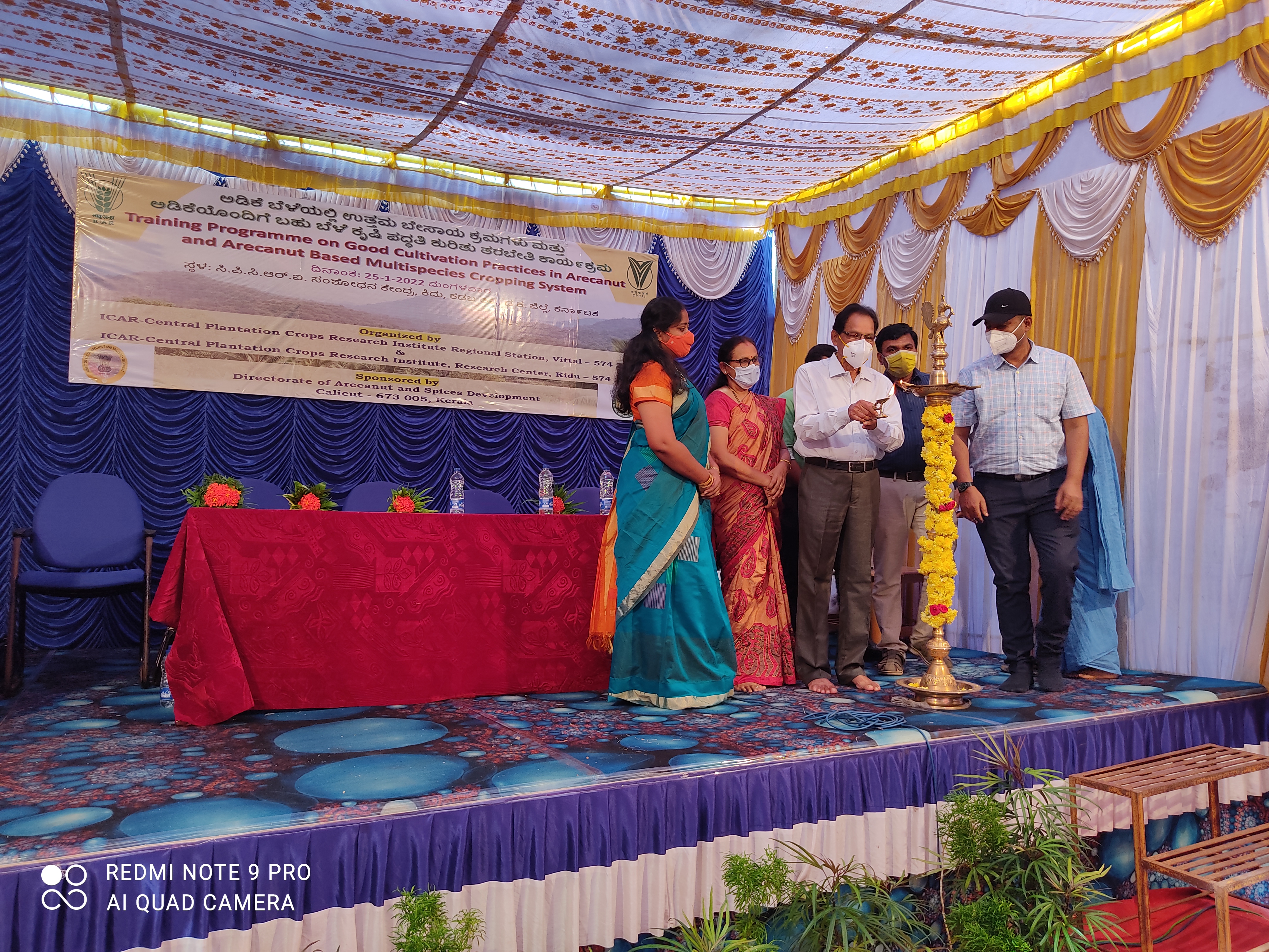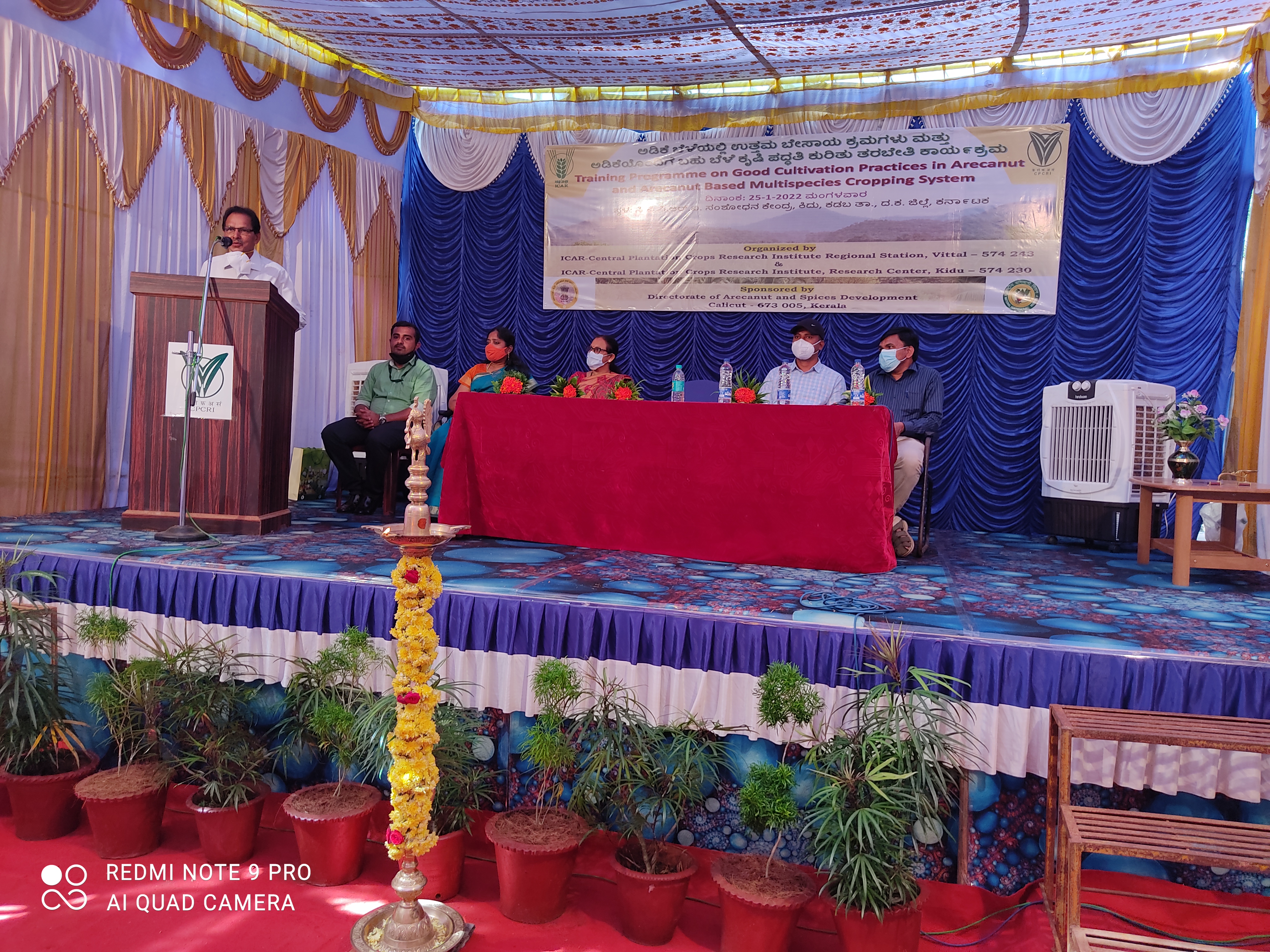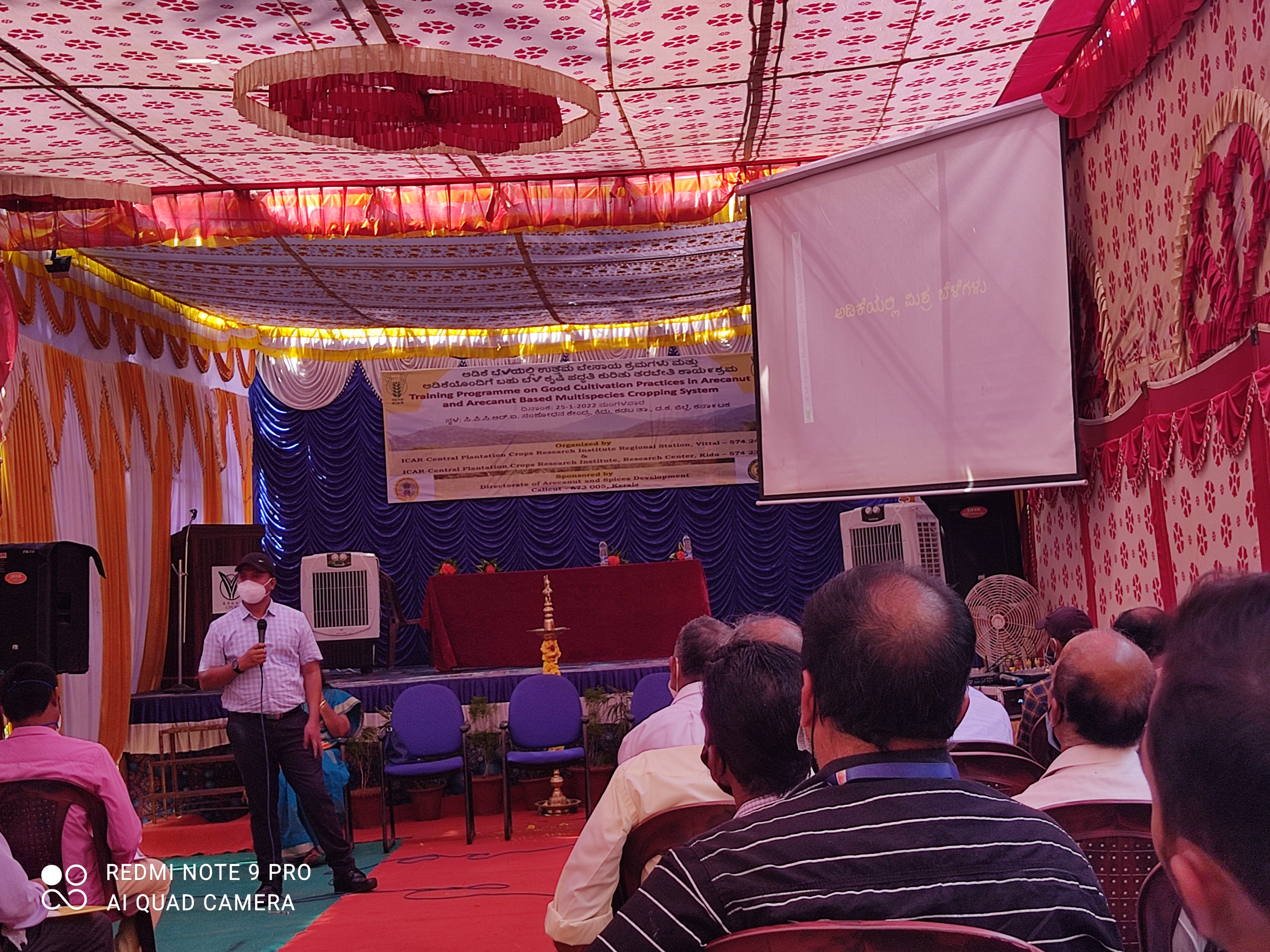 As a part of the Golden Jubilee celebrationsof ICAR-CPCRI Research Centre Kidu, a DASD, Calicut funded training programme on “Good Cultivation Practices in Arecanut and Arecanut based Multi-Species Cropping System” was conducted for farmers at ICAR-CPCRI Research centre, Kidu on 25/01/2022. The chief guest Dr. K. S.Ananda (Formerly Head, ICAR-CPCRI Regional Station Vittal) inaugurated the programme and shared his invaluable experiences and reminiscences about the centre. He motivated the farmers to adopt multi-species cropping system by highlighting itsimportance in obtaining higher income from existing plantations through effective utilization of available natural resourcesand stressed its role in ensuring livelihood security during adverse conditions.The contact officer of this research centre, Dr. V. Niral (Principal Scientist, ICAR-CPCRI Kasaragod) during her presidential address briefed the farmers about the service rendered by ICAR-CPCRI, Kidu in production and distribution of quality planting material production of coconut, arecanut and cocoa to farmers across the country and also emphasizedthat the International Coconut Gene Bank for South Asia and Middle East (ICG-SAME) hosted at this centre is the best among the five global ICGs. Mr. Diwakar, Y., Scientist-in-charge of the centre welcomed all the guests & farmer participants and appealed to the gathering to inform other farmers to make use of the farmer beneficiary events being organized at this centre in commemoration of the golden jubilee year and requested their active participation. Dr. N. R. Nagaraja (Scientist-SS, ICAR-CPCRI Regional Station Vittal) the convener of the programme briefed the gathering about the training programme. Dr. Rajkumar (Scientist-SS, ICAR-CPCRI Kasaragod), proposed the vote of thanks. The event was witnessed more than 150 participants, including farmers not only from the neighbouring places but also from Maharashtra and Tamil Nadu. Immediately after the brief inaugural session, the technical session was conducted. Dr. S. Elain Apshara, Principal Scientist, ICAR-CPCRI RS Vittal, during the technical session updated the farmers on recent developments in cocoa cultivation including improved varieties/hybrids developed by the institute and quality planting material production. Dr. N. R. Nagaraja delivered lecture on improved varieties and hybrids in arecanut, quality planting material production, recent advances in arecanut production technologies and also arecanut based multispecies cropping system. Dr Rajkumar apprised the farmers about the advances in pest and disease management and also responded to farmers queries on crop protection aspects. Demonstration on Bordeaux mixture preparation was also conducted. In addition, Mr. Diwakar, Y. and Dr V. Niral also served as resource person in the farmer-scientist interactive session. The farmers expressed their requirement of practical demonstration on use of bio-control agents such as Trichoderma, EPN etc. Following the interactive sessions, a quiz programme was conducted for the farmer participants. The programme came to an end with distribution of prizes to the winning teams. A small exhibition with display charts on improved varieties/ hybrids, quality planting material production, production technologies, arecanut based cropping system, integrated pest and disease management etc. was also arranged for giving first-hand information to the participants.