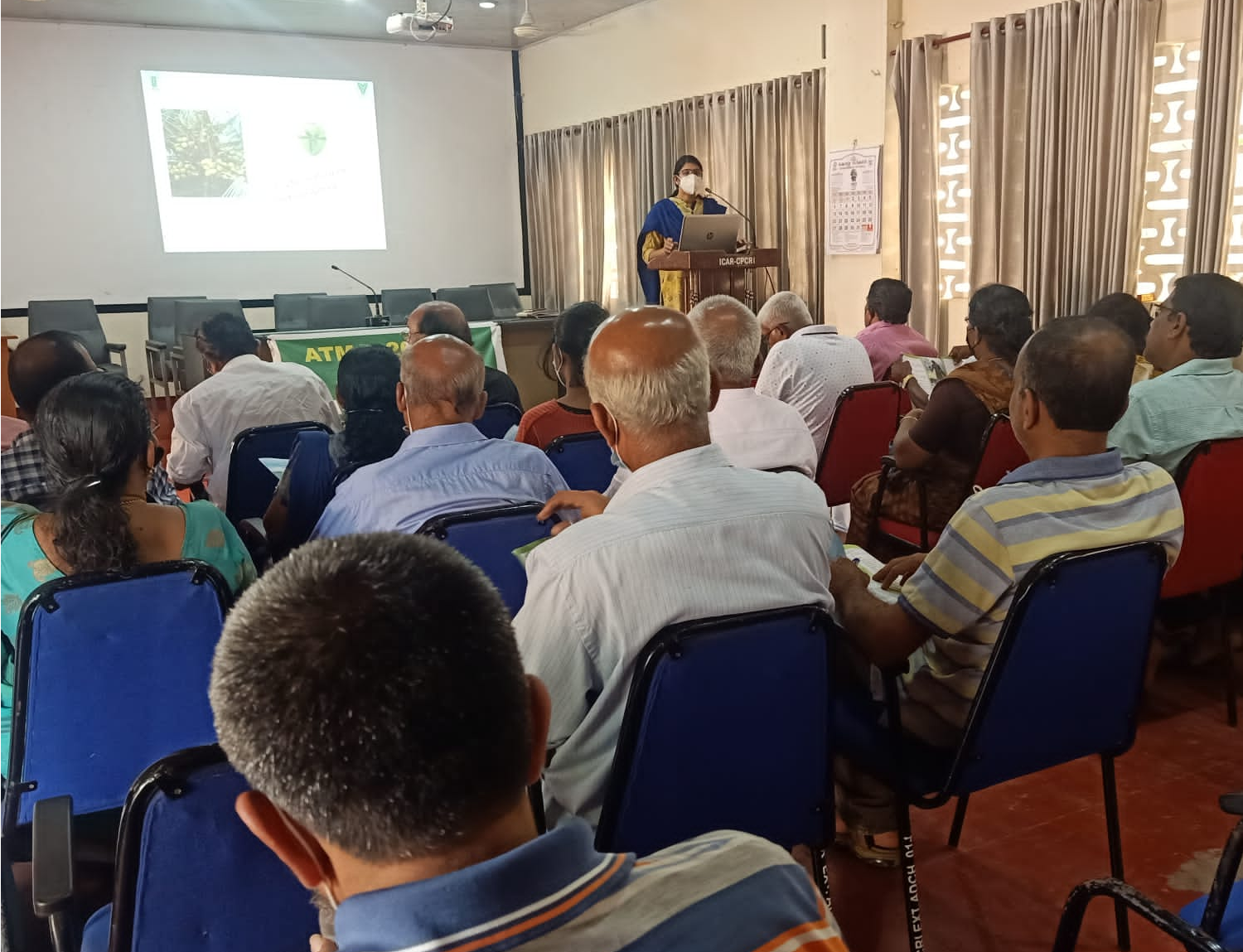 A one day training programme on ‘Scientific Coconut Cultivation’ was organized for the farmers of Krishi Bhavan, Kottayam on 16/03/2022 at ICAR-Central Plantation Crops Research Institute, Regional Station, Kayamkulam as part of the ATMA programme. Twenty farmers and 3 officials of Krishi Bhavan attended the training. The training started at 10.00 am and there were sessions on Good Agricultural Practices in coconut farming, familiarisation of varieties and hybrids of coconut, management of pests and diseases of coconut followed interactive session with the concerned scientists. The classroom training programme was followed by field visits to the experimental plots of ecological engineering, evaluation of green dwarfs for RWD resistance, Kalpasankara fertigation trial and coconut nursery. The sessions were handled by Dr. Jeena Mathew, Dr. Indhuja, S, Dr. M. Shareefa and Dr. Merin Babu.