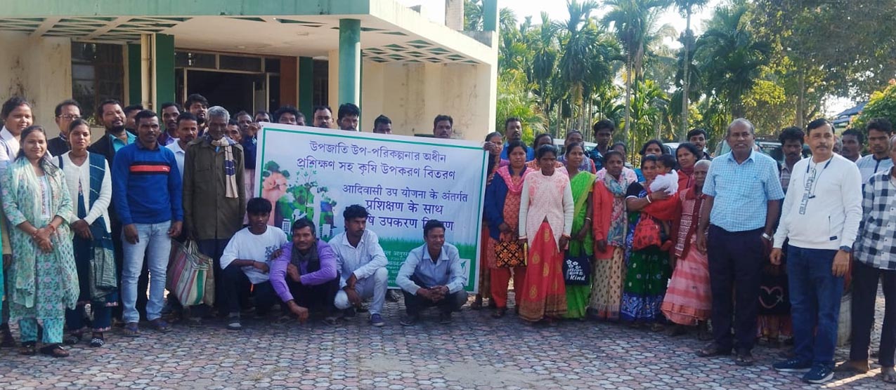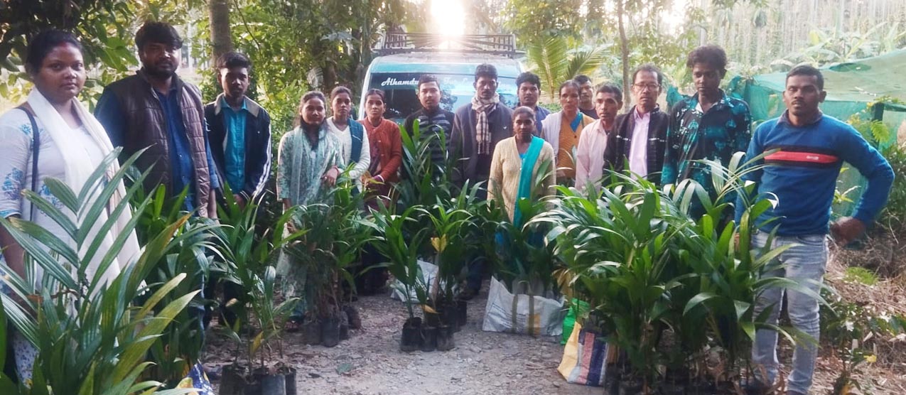 A capacity building programme on “Scientific arecanut cultivation” cum field demonstration cum Input distribution was organized on 08.12.2025 at ICAR-CPCRI, Research Centre, Mohitnagar under Tribal Sub Plan. A total of 59 scheduled tribe farm family participated in this programme. Dr. K Ponnusamy, The Head, Division of Social Science, ICAR-CPCRI, Kasaragod addressed the gathering and elaborated the concept and purpose of the scheme. Dr. Arun Kumar Sit, Scientist in Charge of the Centre discussed in detail on cultivation aspects of arecanut. After the training programme, a field demonstration on arecanut based cropping system was also conducted among the community. A total of 1180 numbers of arecanut seedlings cv Mohitnagar @20 to each was distributed among the farmers.