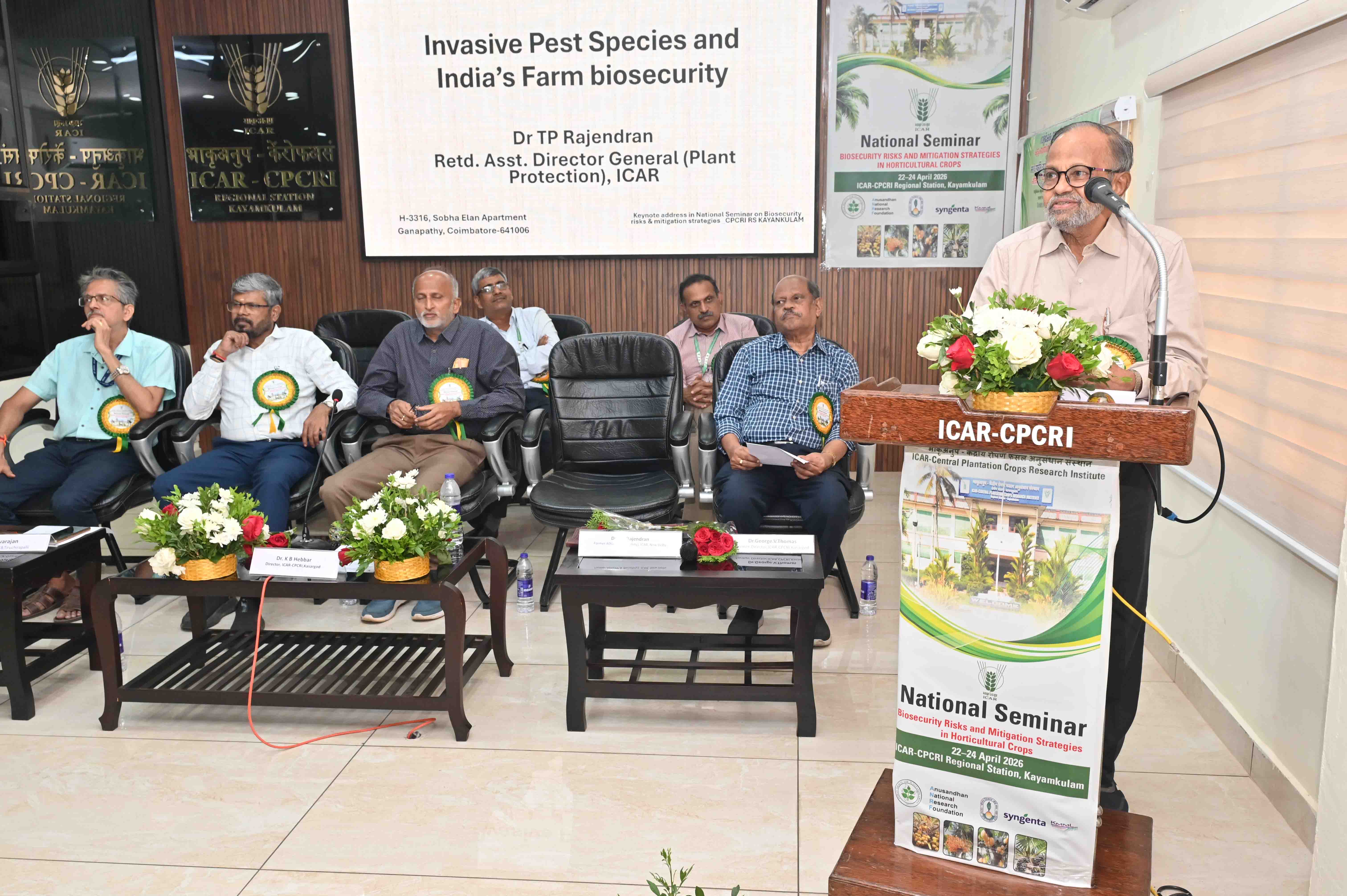The seminar was inaugurated virtually by Dr. S. K. Singh, Deputy Director General (Horticulture Science), ICAR. In his address, he highlighted the growing threats of bioinvasions to horticultural crops, noting their significant economic impact and potential risks to national livelihood security. He called for detailed deliberations and the development of actionable strategies, including a white paper on sustainable biological solutions to combat biosecurity threats. The Presidential address was delivered by Dr. K. B. Hebbar, Director of ICAR-CPCRI, Kasaragod, emphasizing the interconnected nature of abiotic and biotic stress factors. He cited examples such as the rugose spiralling whitefly and coconut eriophyid mite infestations, along with leaf spot disease in arecanut, which have caused severe economic losses. He noted that area-wide, farmer-participatory management strategies are being implemented for effective outreach.