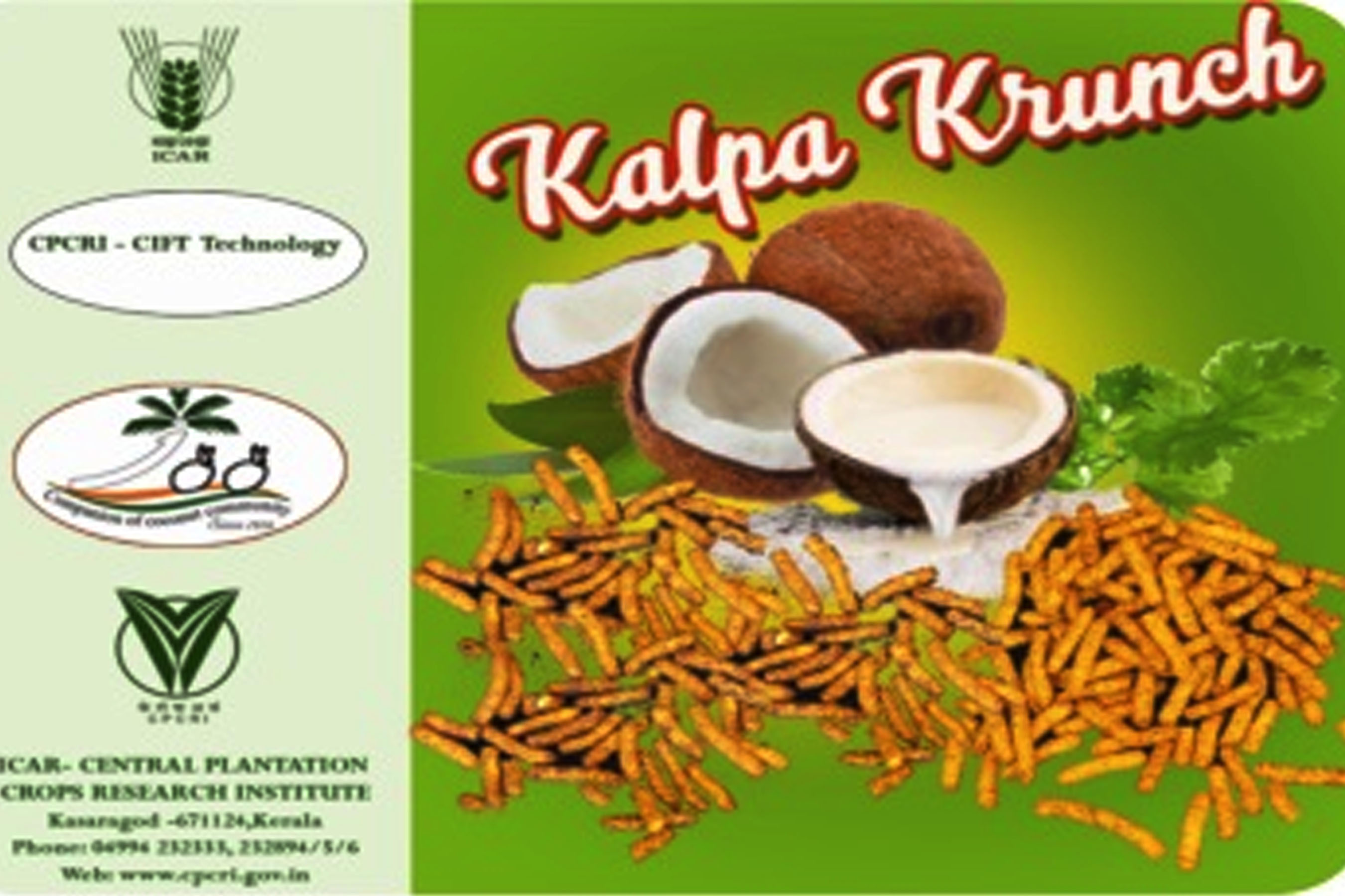 A complete package of technology for the production of extrudates from the different combinations of coconut milk residue, virgin coconut oil cake, coconut haustorium, maize, broken rice and millets has been developed, demonstrated, commercially launched in the name of ‘Kalpa Krunch’ and successfully transferred to two entrepreneurs.